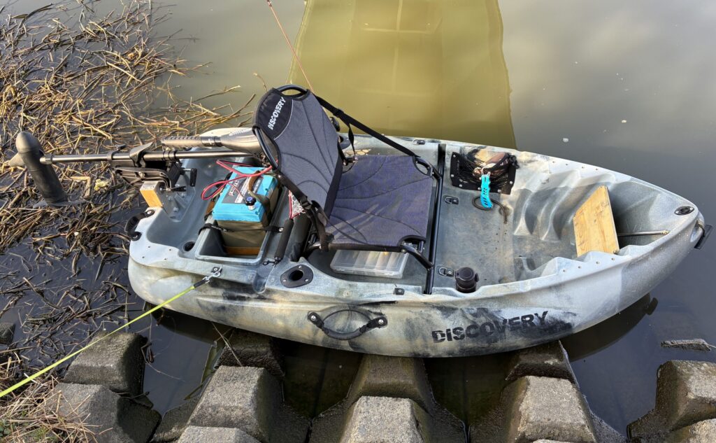 シットオンタイプの短いカヤックにハンドコンのエレキモーターを取り付けています。