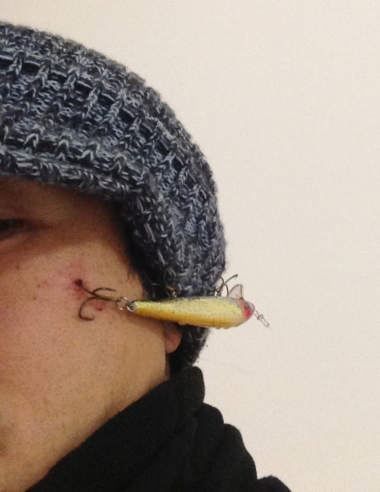 ビリビリした感触でハッとして、ルアーが顔に当たったことに気がつきました。