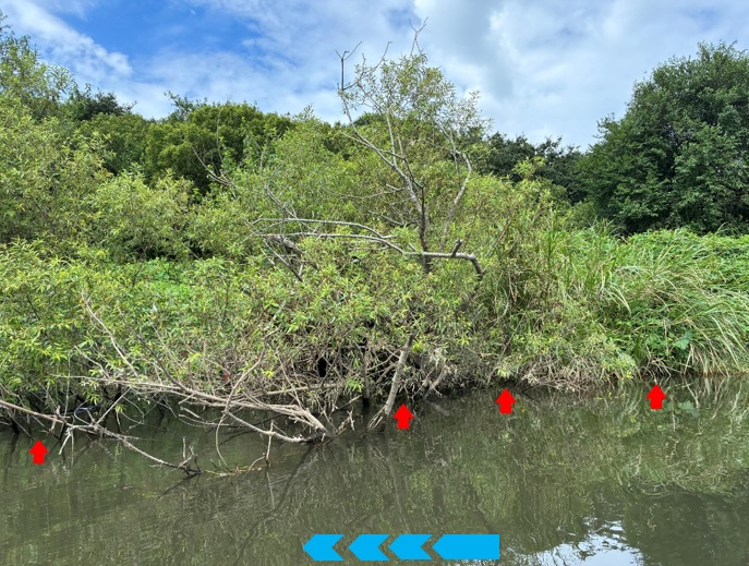 私はここを釣りながら流すとしたら、赤い矢印のポイントにトップウォーターのルアーを投げ込みたくなります。