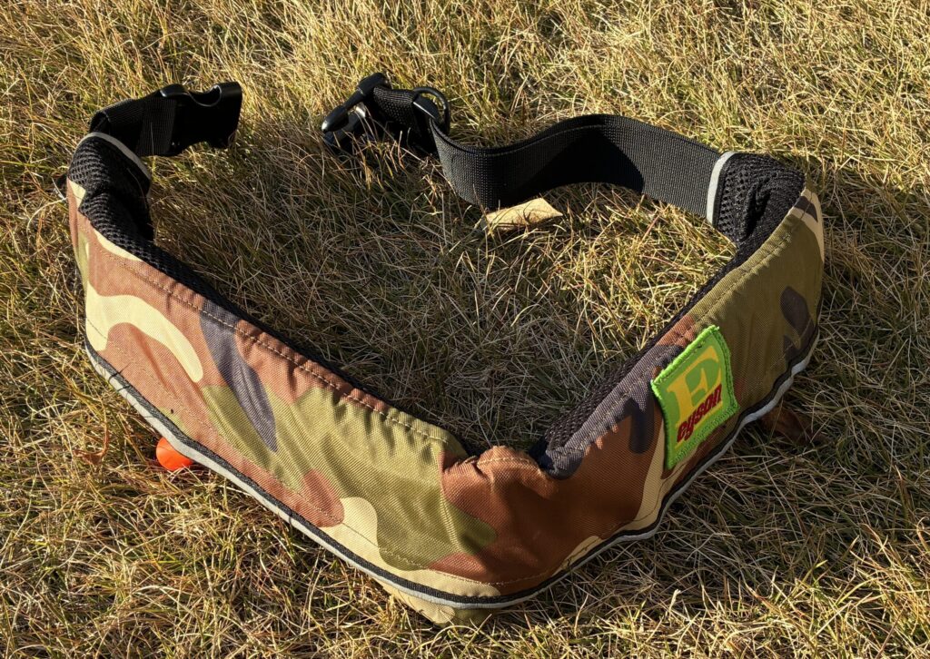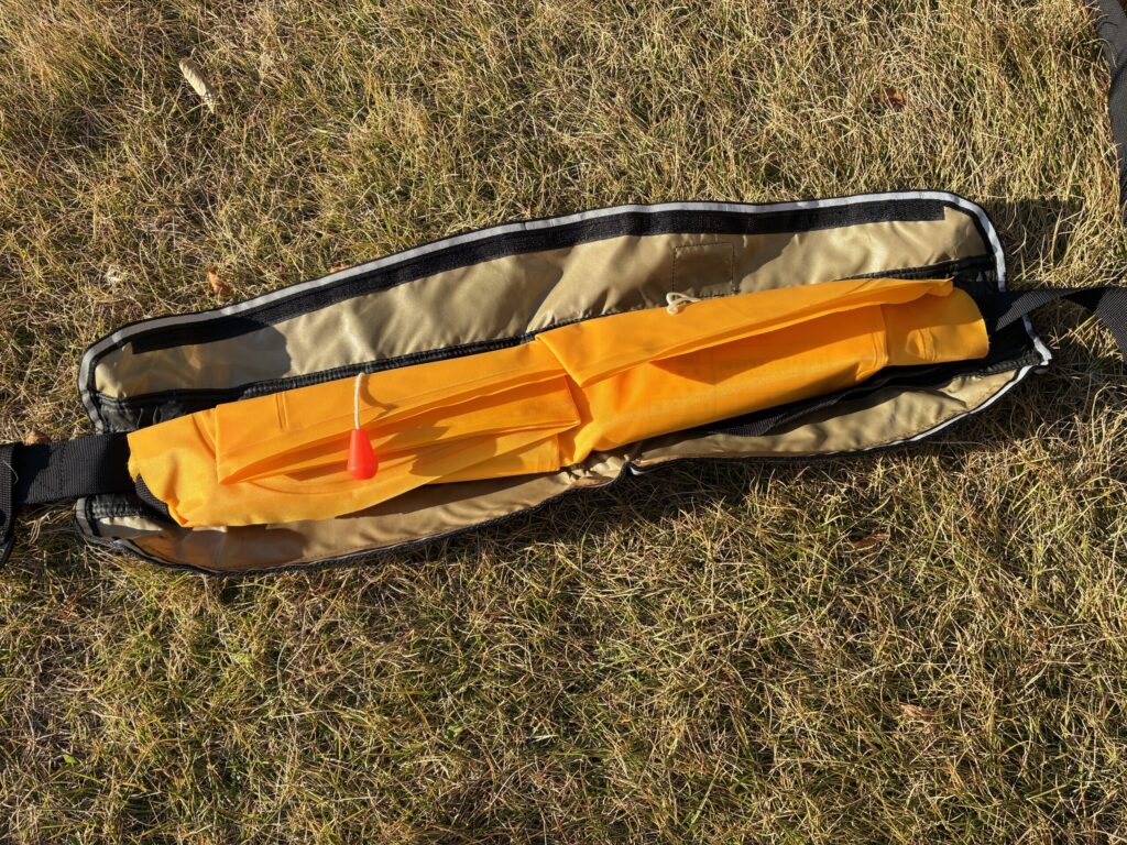 私はフロボで釣りをするときはインフレータブル式(自動膨張式)のライフジャケットを着用しています。
