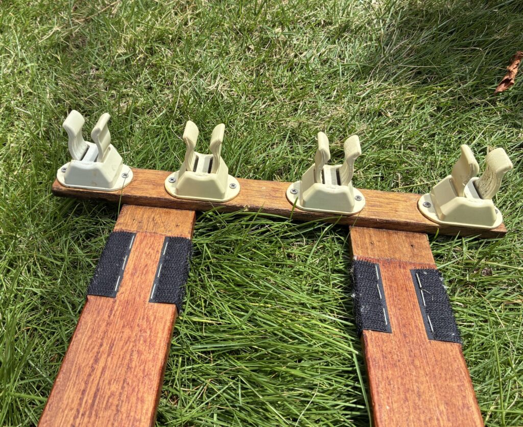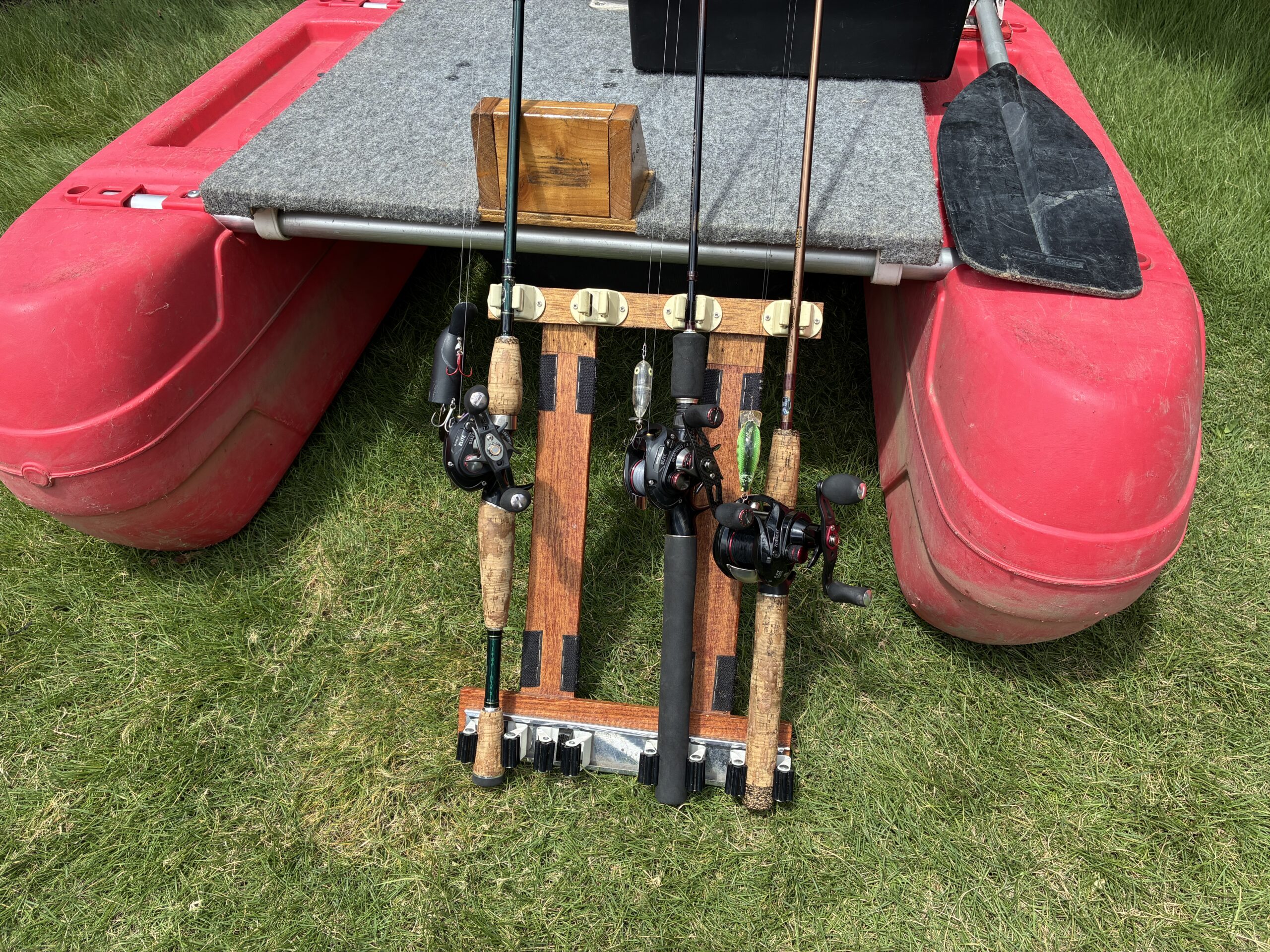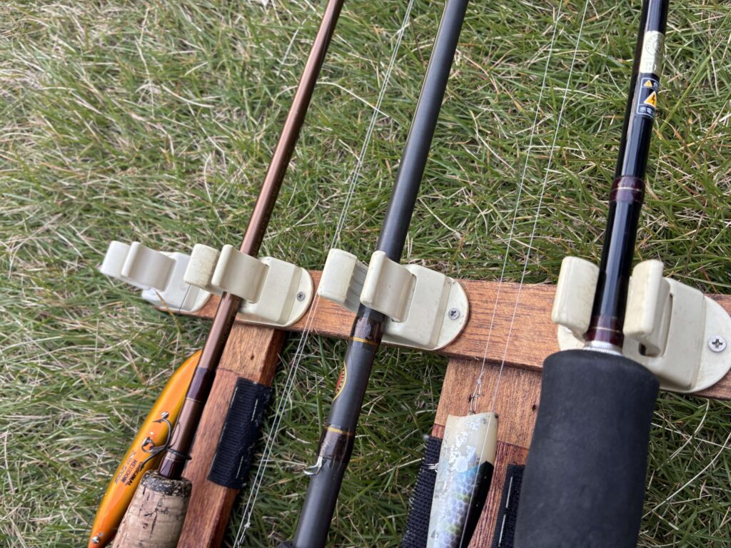 この自作ロッドホルダーは10年近く前に、フロートボートの釣りで使うため、とりあえず数時間のやっつけ仕事で製作したものです。