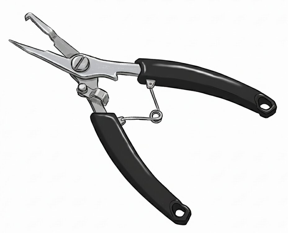 釣具屋にならんでいるスプリットリングプライヤーは、下のイラストのようにプライヤー、ハサミ、スプリットリングオープナーの3つの機能を併せもった製品を多く見かけます。