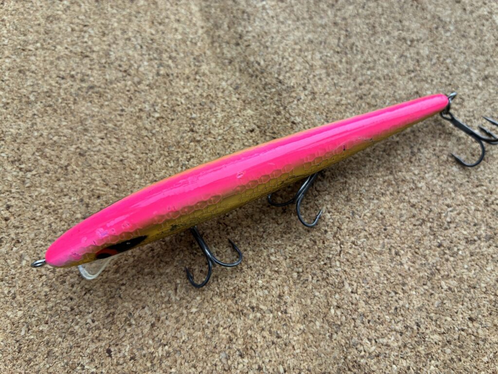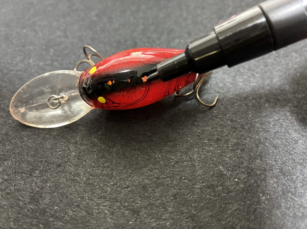 今回はクランクベイトの背中を黒で、ジャークベイトの背中をピンクでタッチアップしました。